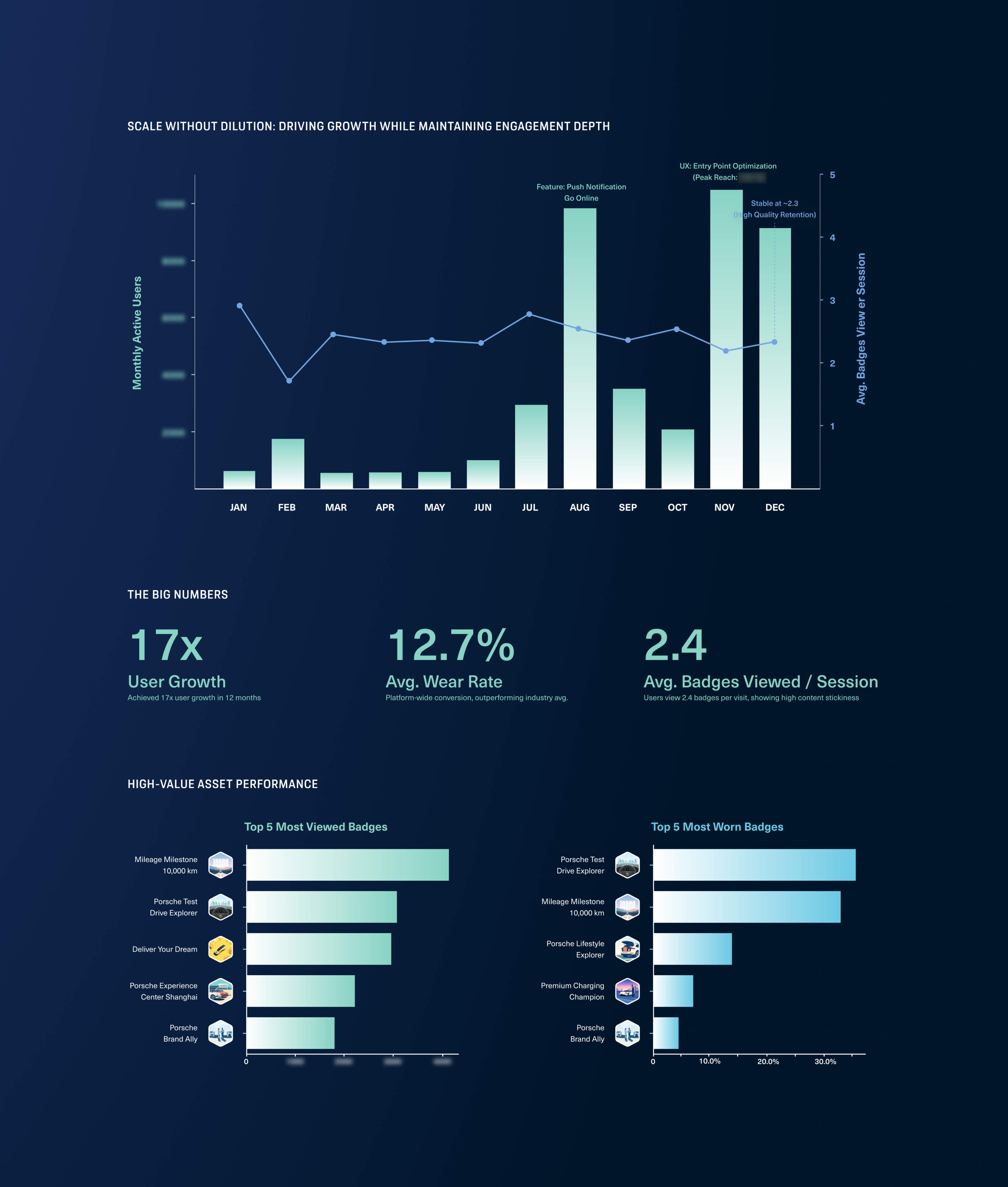 The Porsche Badge Center turned digital incentives into a growth engine, achieving 17x MAU growth and a 12.7% average wear rate. By linking rewards to high-value actions like test drives (which saw a 35.7% conversion), the project successfully built digital brand equity and supported Porsche’s transition into a holistic brand ecosystem.