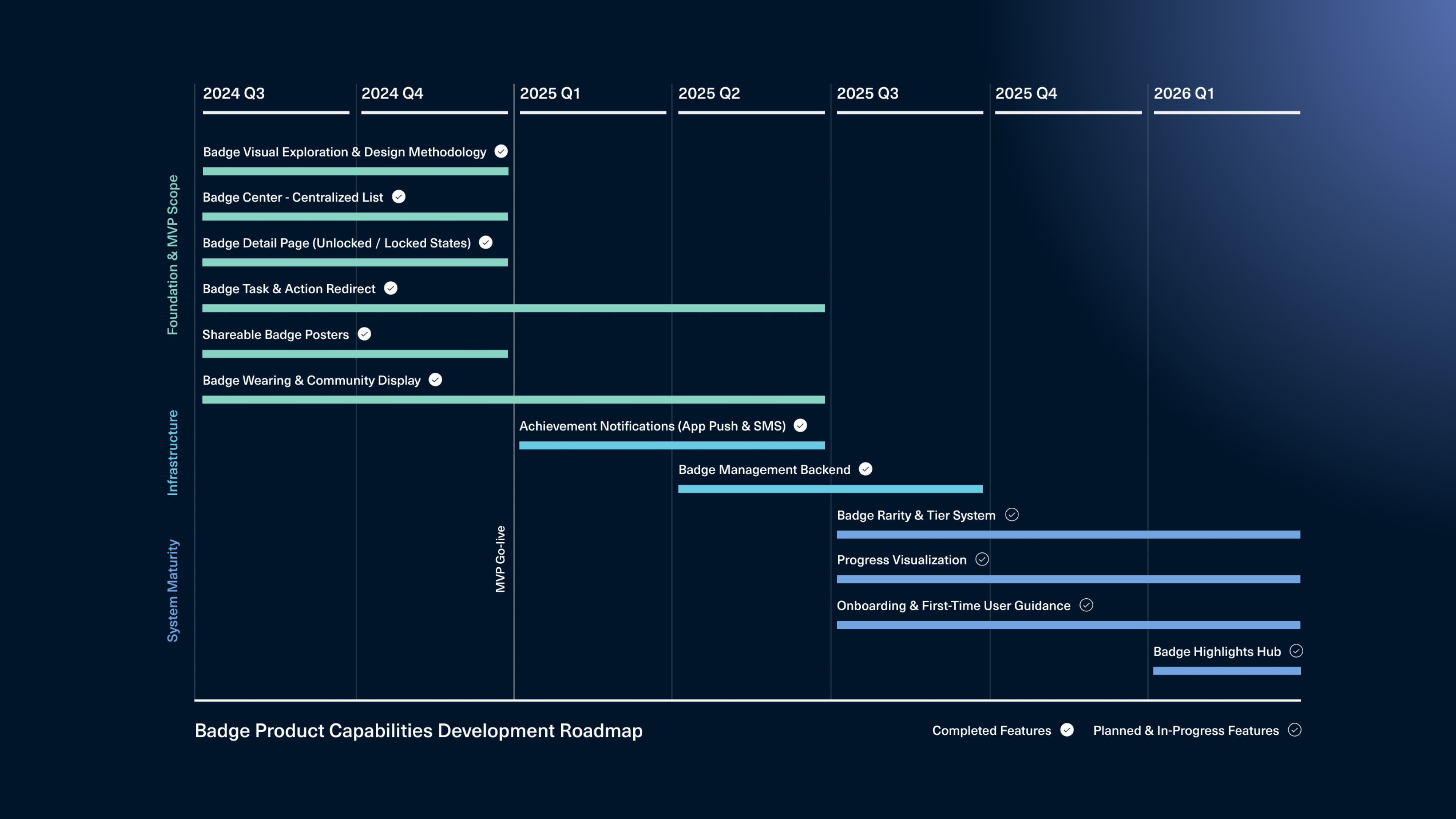 The Badge Center interface allows users to browse, earn, and share badges seamlessly, integrating notification flows, tier progression, and social sharing to reinforce a sense of recognition and belonging.