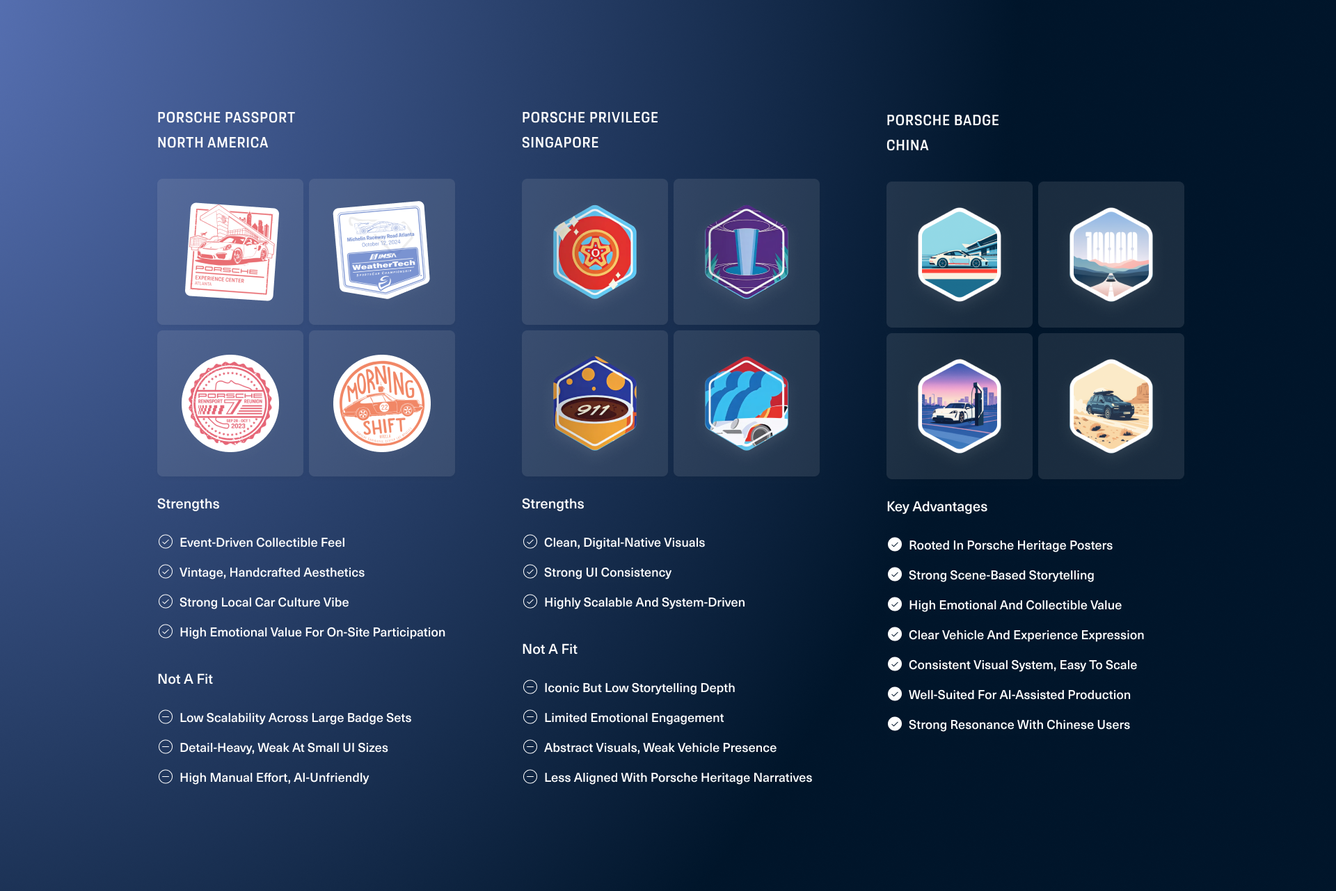 Before designing the Porsche Badge system, multiple existing regional badge styles were reviewed, including Porsche Passport (North America) and Porsche Privilege (Singapore).