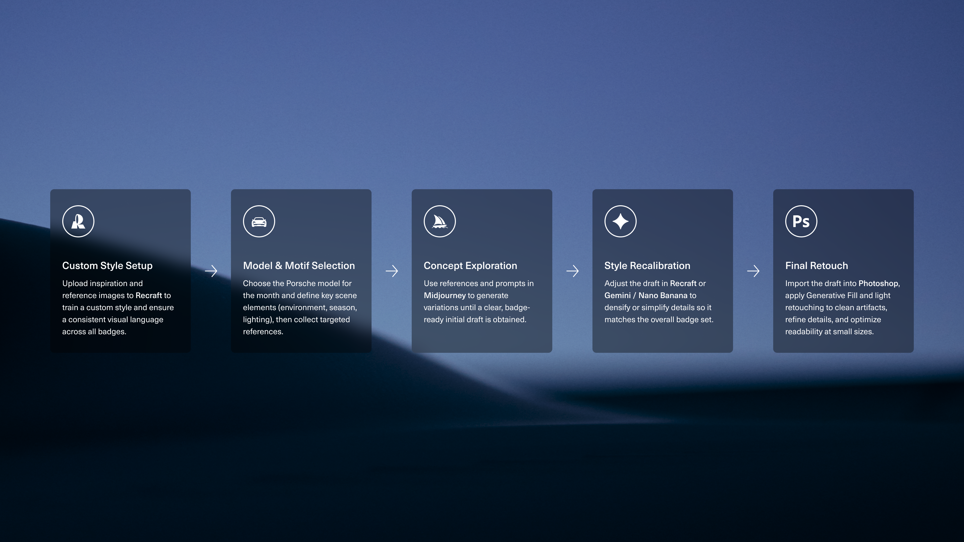 The Porsche badge visuals are created through an AI-assisted workflow that balances consistency and flexibility.