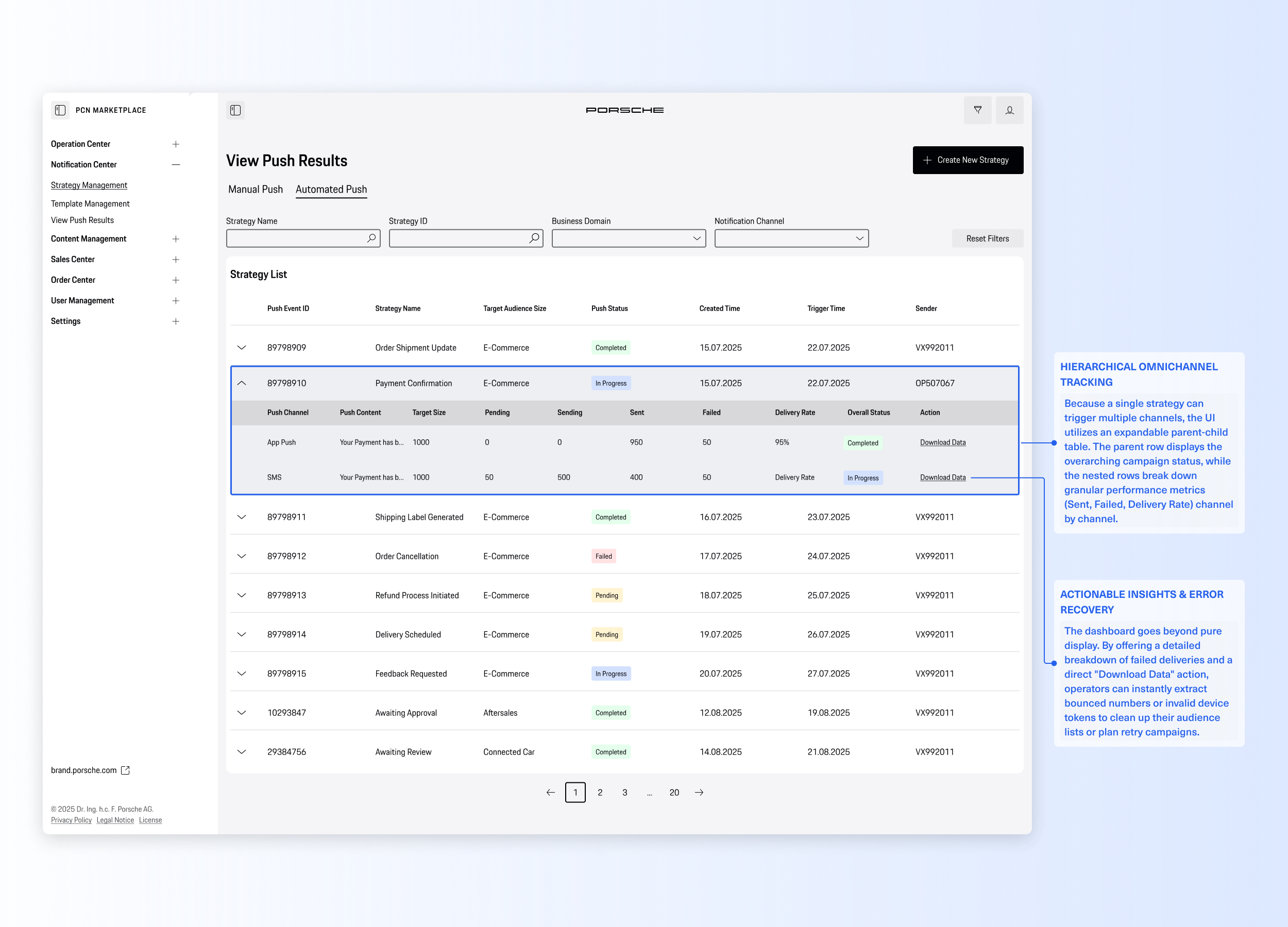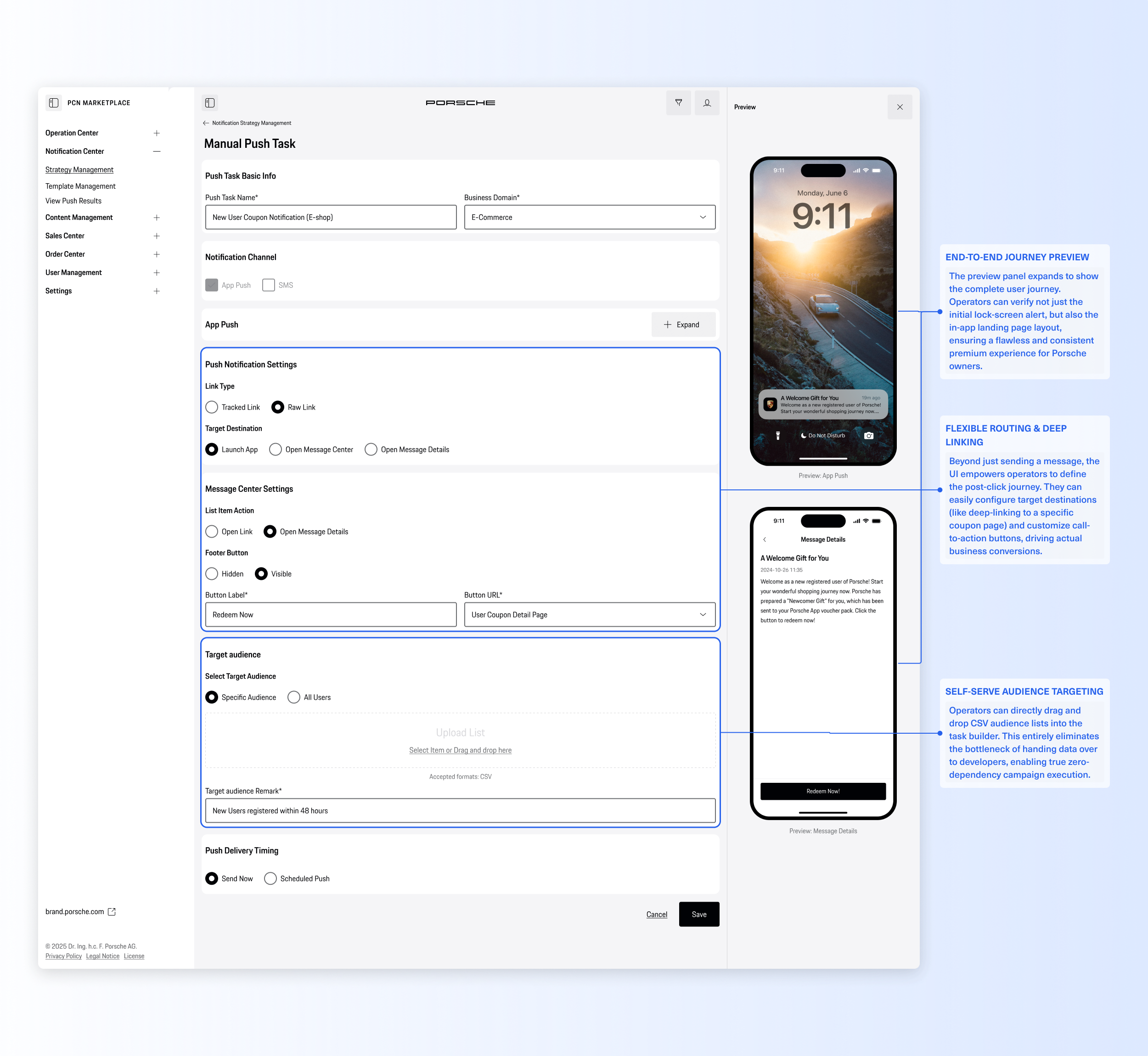 To fix this, we designed an all-in-one Notification Center. Our goal was to turn an error-prone chore into a smooth, effortless workflow. We introduced a visual template editor (so operators no longer need to write code), easy setups for both manual and automated messages, and a clear data dashboard. Now, the team can work much faster and with total confidence, ensuring every message they send matches Porsche's premium standard.