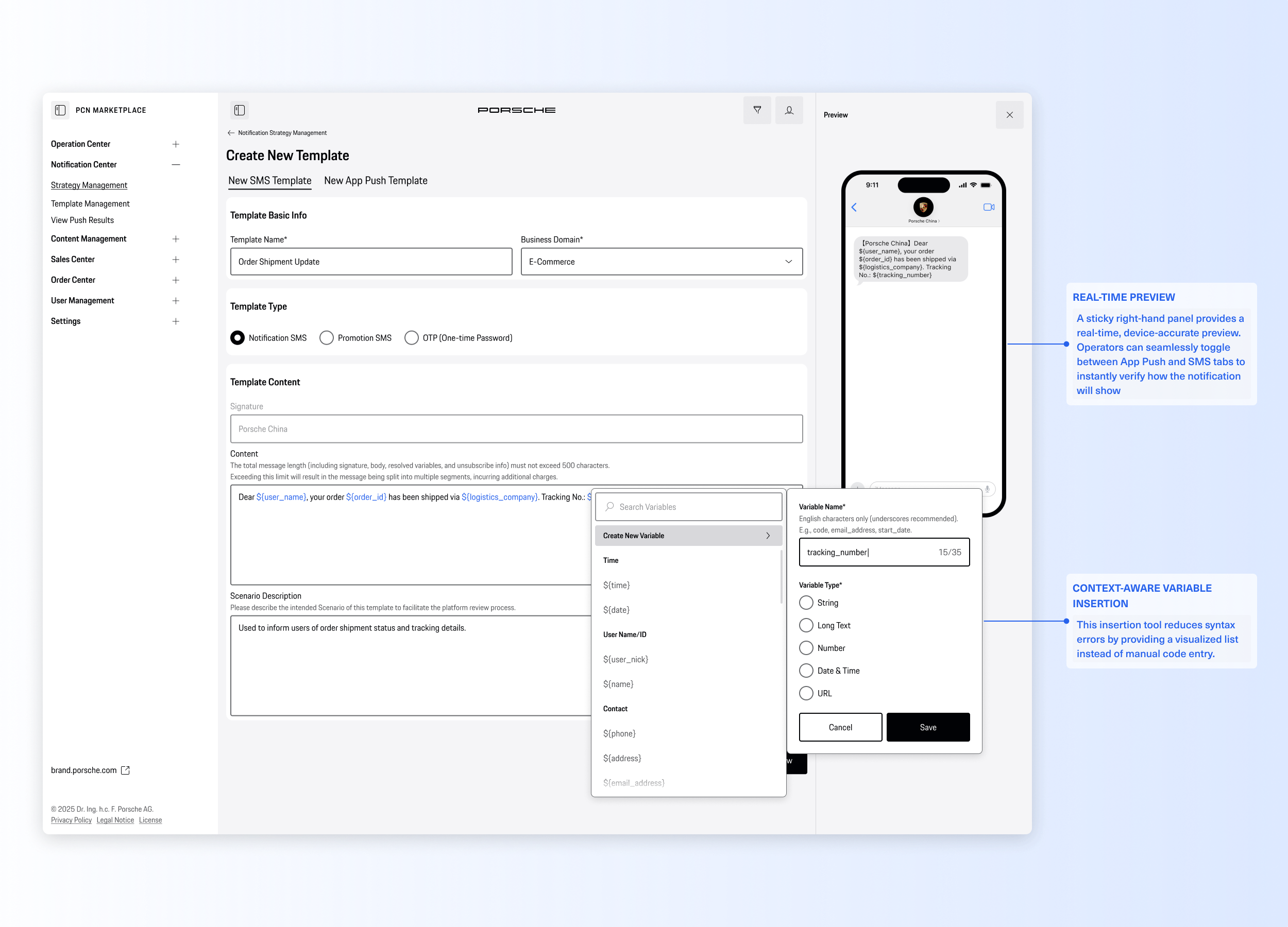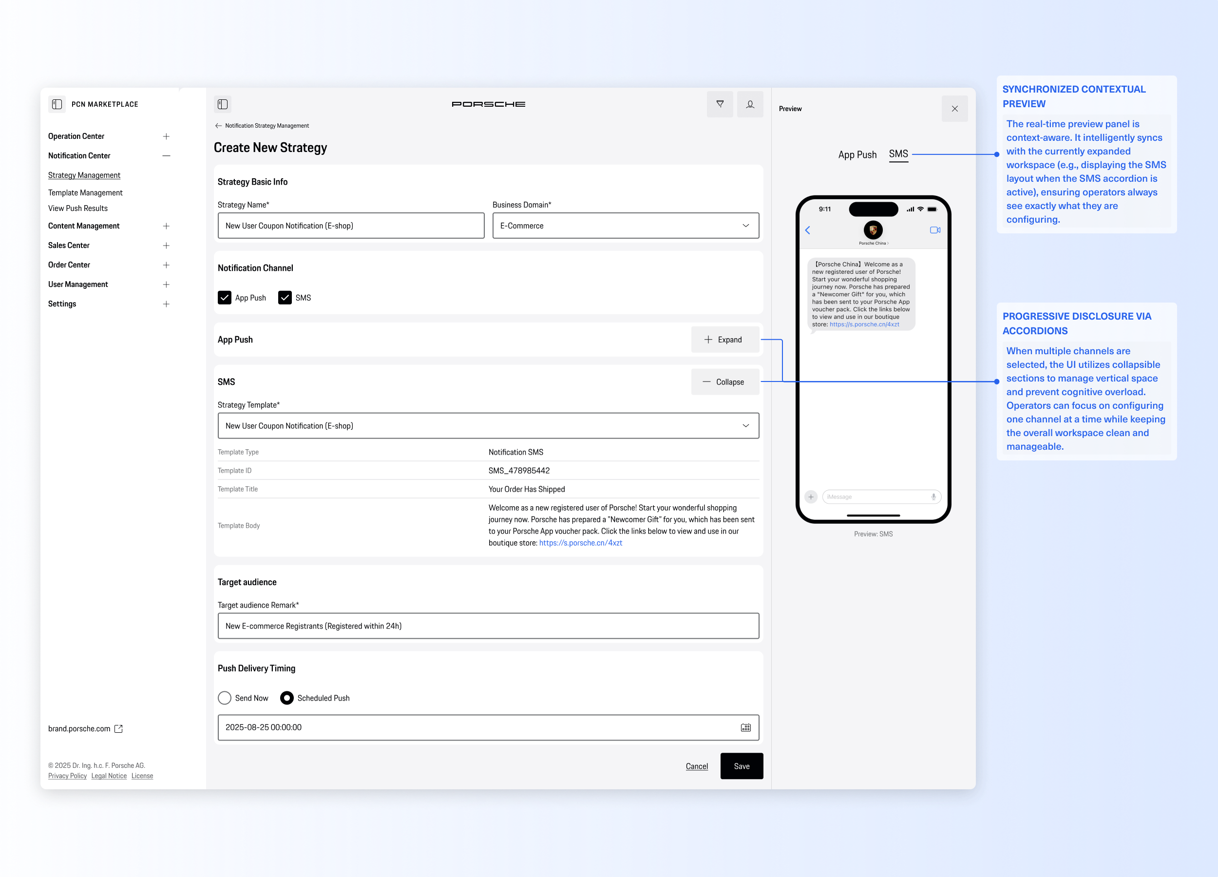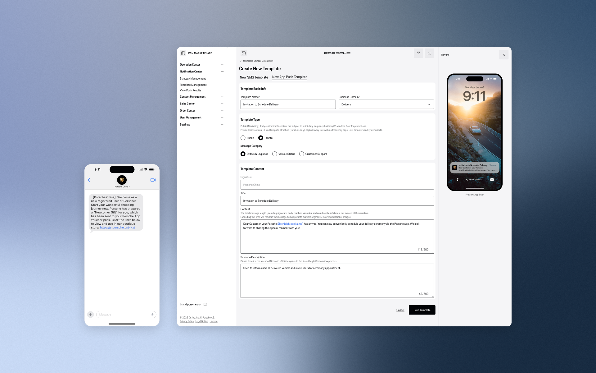 The Porsche Notification Center is a centralized B2B operation console designed for Porsche China. It transforms a highly fragmented, developer-dependent notification process into a streamlined, no-code omni-channel hub. By introducing a visual template editor and automated lifecycle strategies, the platform empowers the operations team to independently launch, manage, and track campaigns across SMS, App Push, and the WeChat ecosystem with zero coding errors.