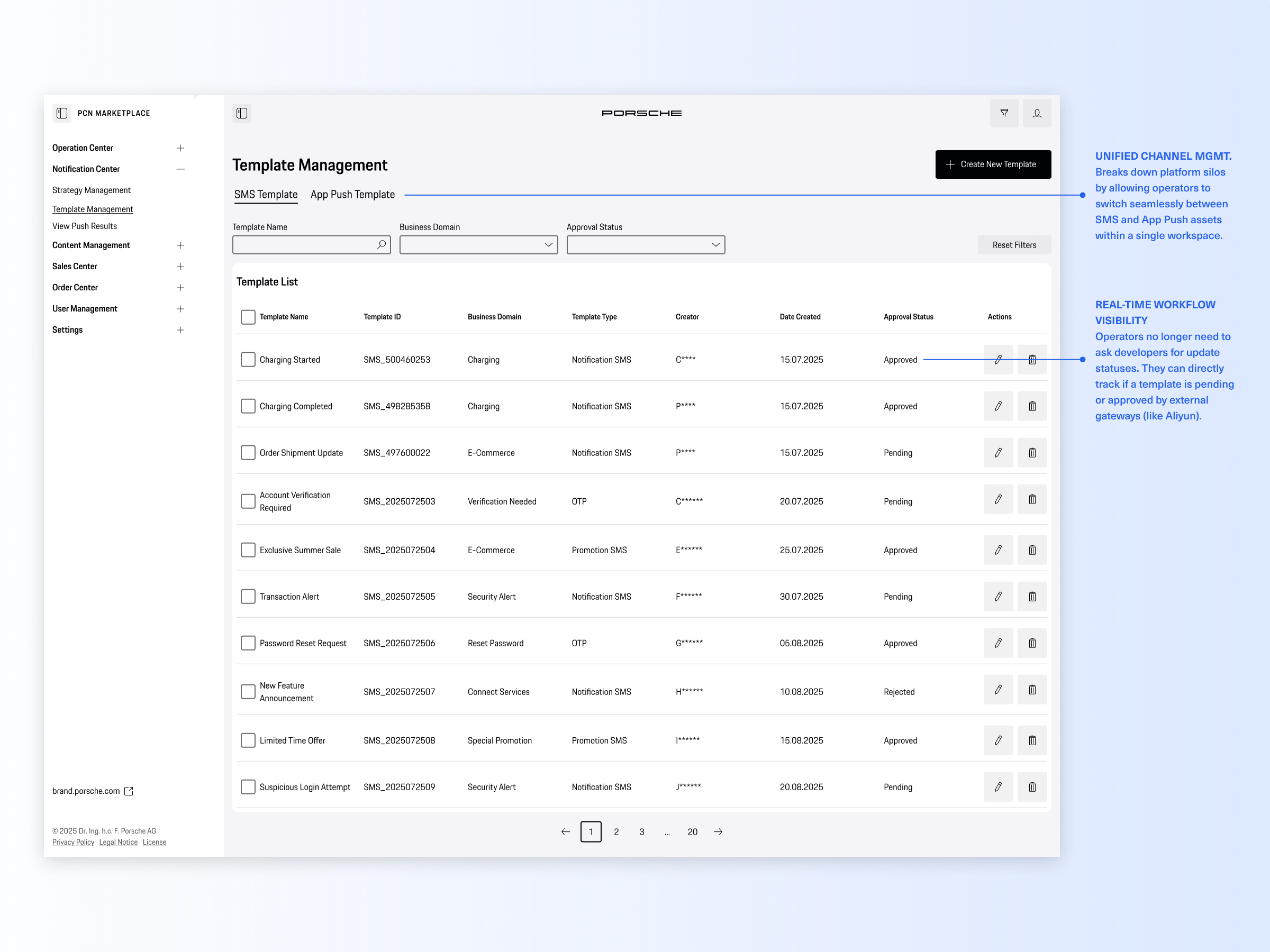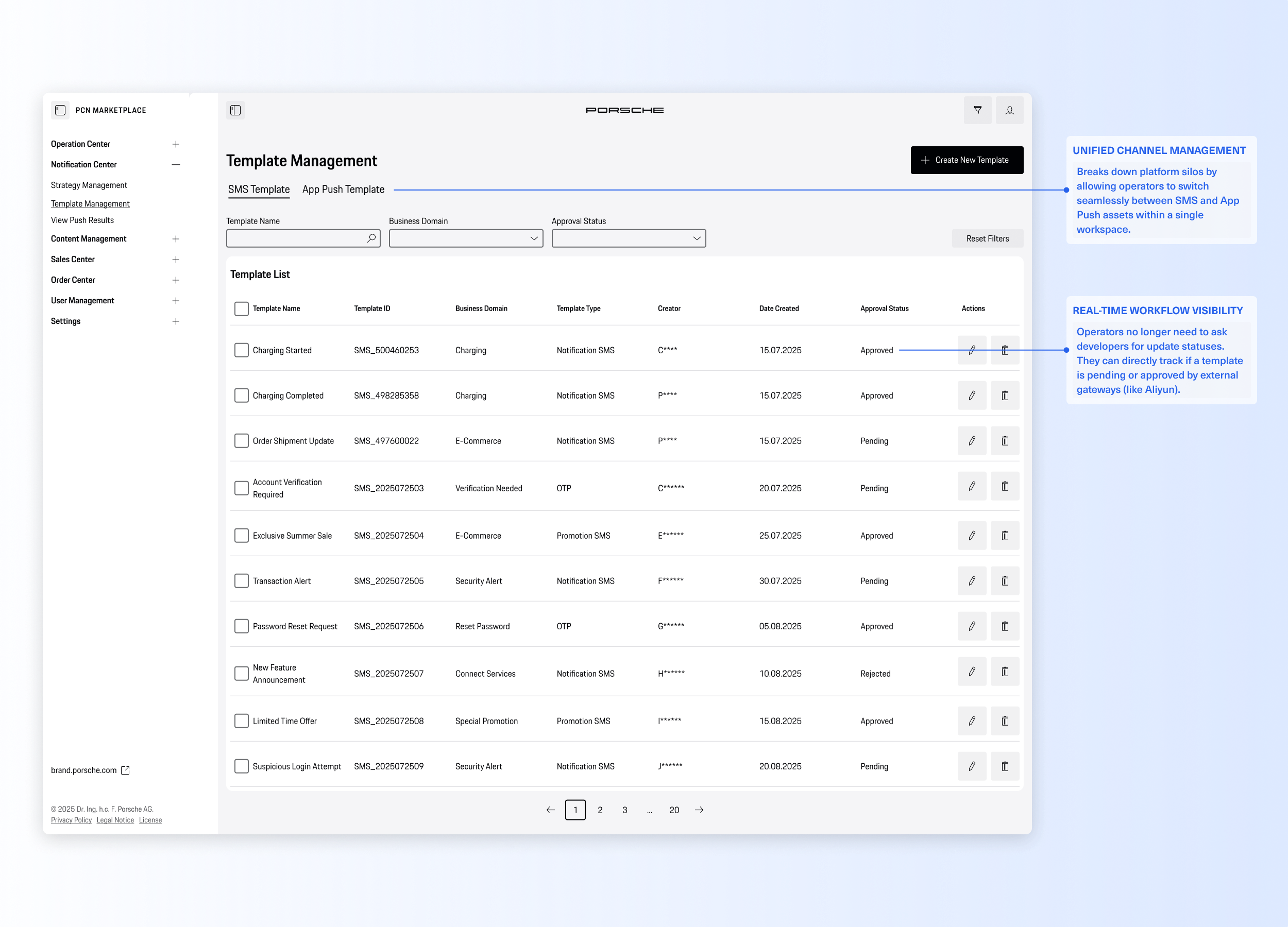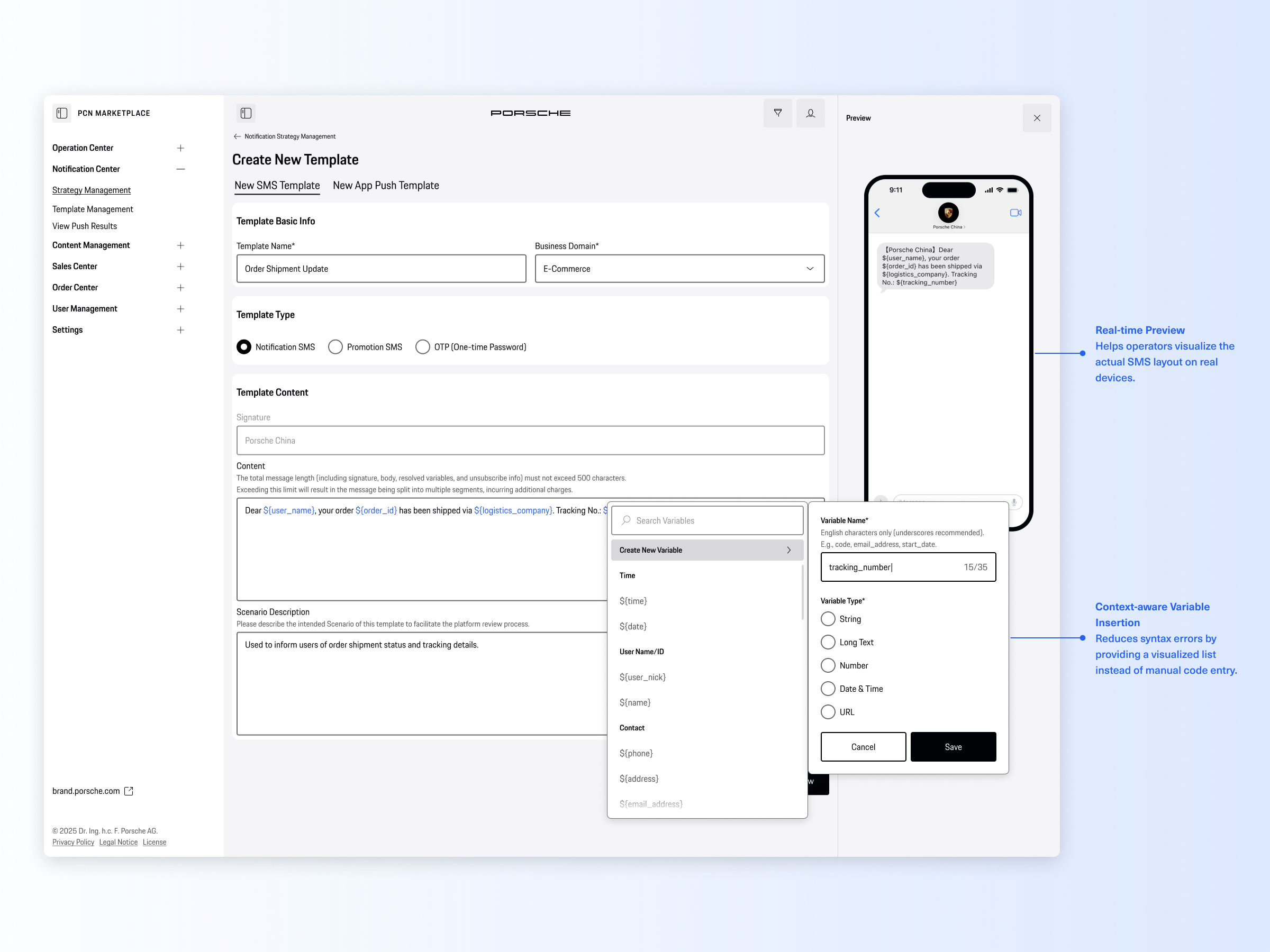 The Porsche Notification Center is a centralized B2B operation console designed for Porsche China. It transforms a highly fragmented, developer-dependent notification process into a streamlined, no-code omni-channel hub. By introducing a visual template editor and automated lifecycle strategies, the platform empowers the operations team to independently launch, manage, and track campaigns across SMS, App Push, and the WeChat ecosystem with zero coding errors.