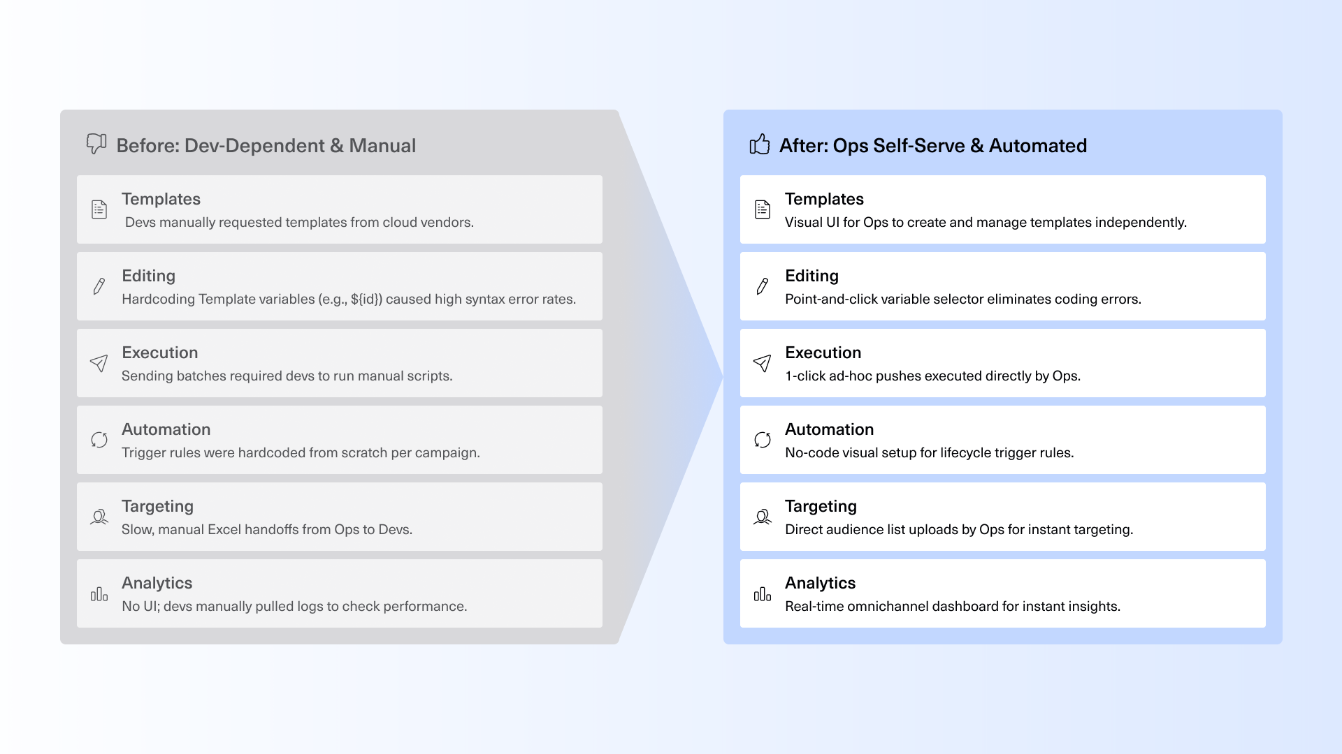 Eliminated the "developer bottleneck." The marketing team can now execute and track omnichannel campaigns entirely independently.