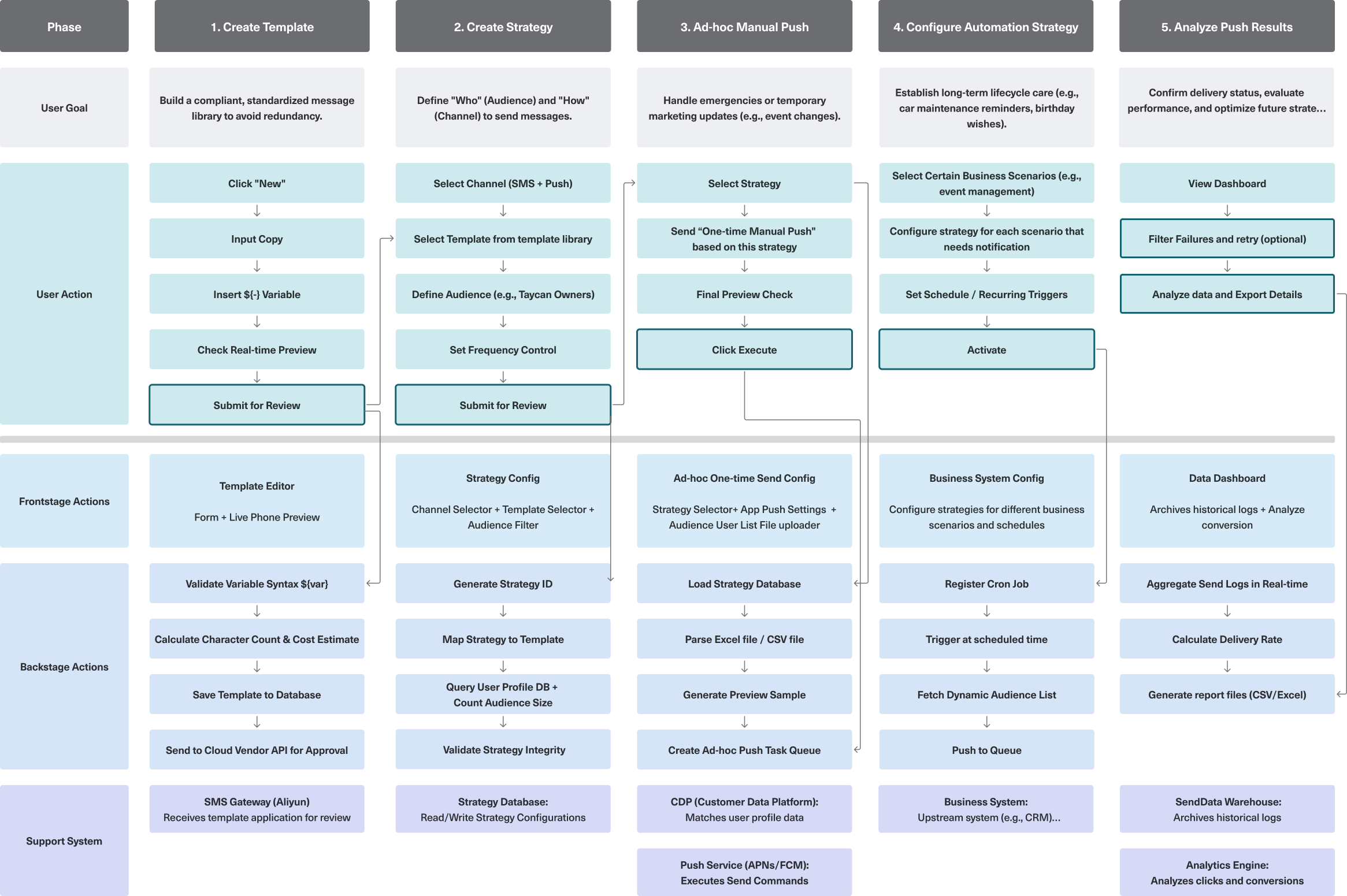 To visualize the system's complexity, I created an end-to-end Service Blueprint. It breaks down the campaign lifecycle into five core phases—from template creation to data analysis. By mapping the intersection of User Goals, Frontstage Touchpoints, and Backstage Logic, this blueprint ensures that the new self-serve experience is fully supported by a robust and logical system architecture.