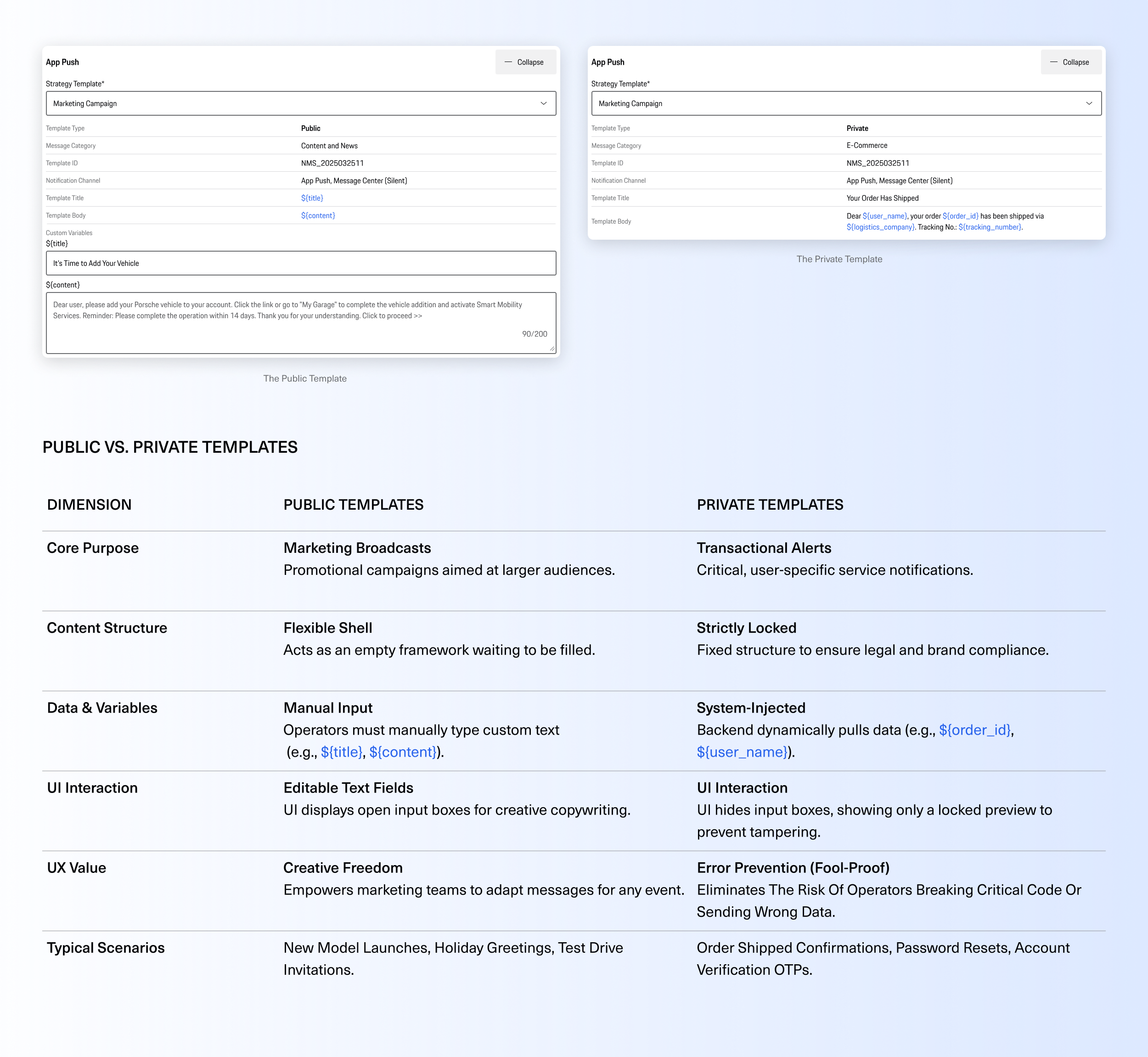 The system intelligently adapts its UI based on the template's business nature. For Public Templates (Marketing), we provide editable text fields to maximize creative flexibility. However, for Private Templates (Transactional), the UI strictly locks the content into a read-only state. This prevents operators from accidentally modifying compliance-approved alerts and eliminates manual data entry, relying entirely on secure backend variable injection.
